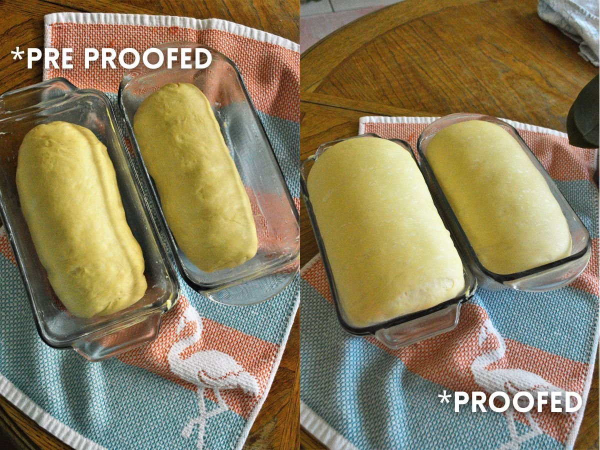 Grease your loaf pan with butter or oil before placing your dough into the pan crease side down. Then cover once again with a towel and allow to rest for another hour. Depending on the humidity in your home, more or less time may be required. Refer to the image below as to what pre-proofed and ready-to-bake looks like.